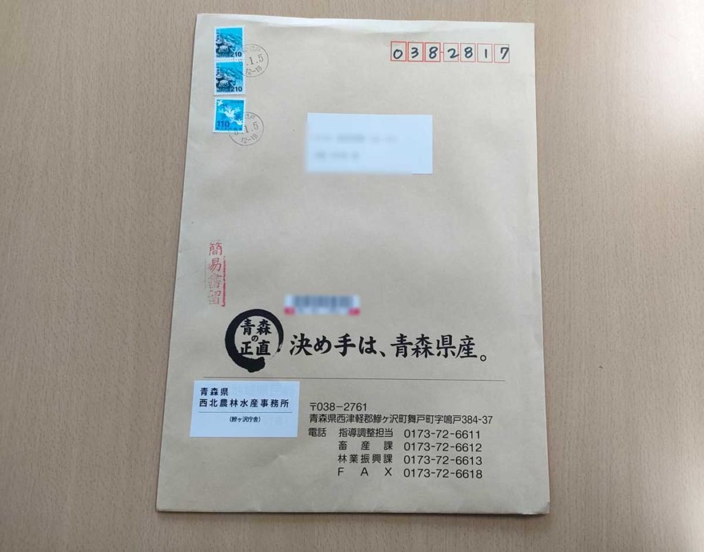 差出人を見ると、青森県 西北農林水産事務所。