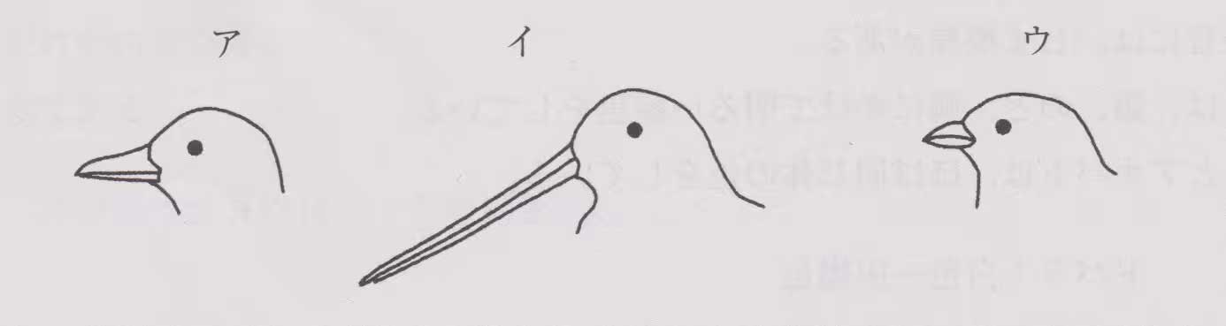 問53:くちばしの形を示した次の図のうち、シギ類のくちばしはどれか。