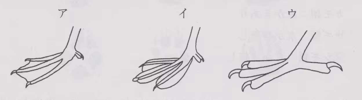 問56:足ゆびの形を示した次の絵のうち、獲物をとらえるのに適した足ゆび(猛禽類)はどれか。