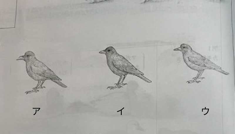 ハシブトガラスはくちばしが太く、頭が丸い。 イ:ハシボソガラス ウ:ミヤマガラス